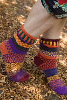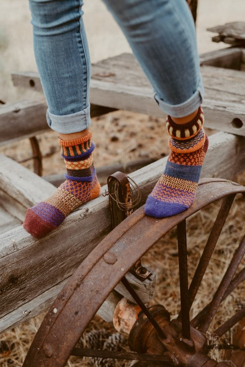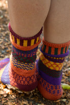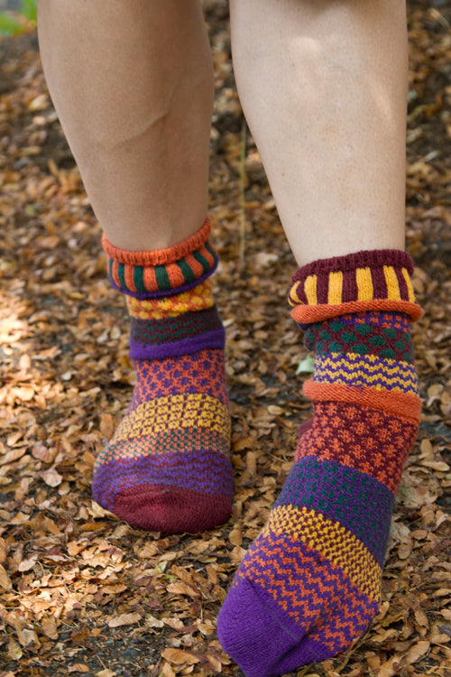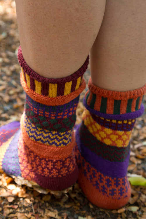 Rich autumnal colors combine for a quirky twist on traditional Fair Isle patterning. Just like a Fair Isle sweater, the colorwork results in a double-thick knit, for an extra-cozy sock! Like all of Solmate's styles, each pair features two mismatched socks, in colors that go together perfectly.