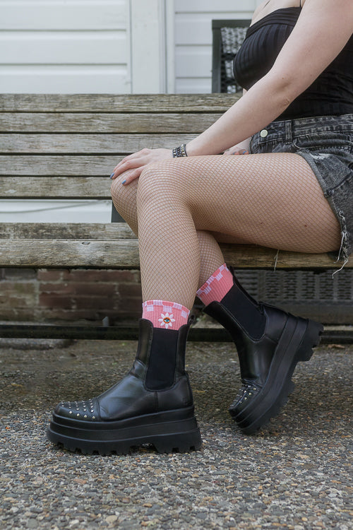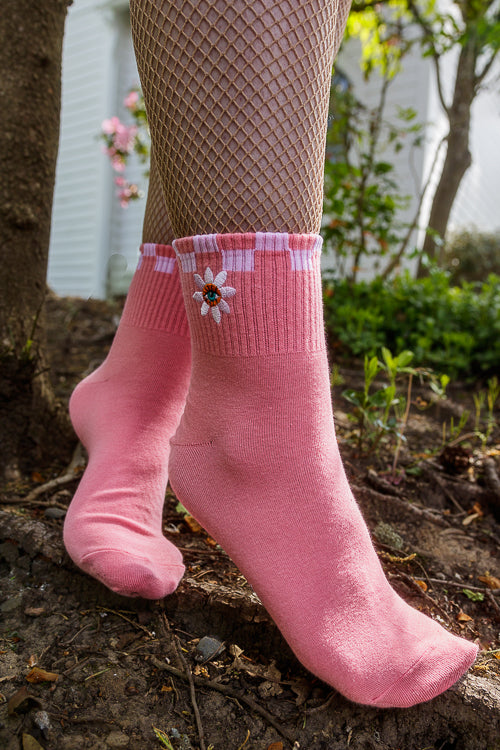 These pink ribbed ankle socks feature a band of white checkering along the top edge, and an embroidered daisy, with a subtle eye hidden in the center!