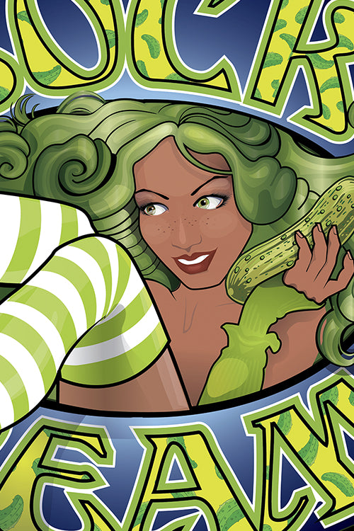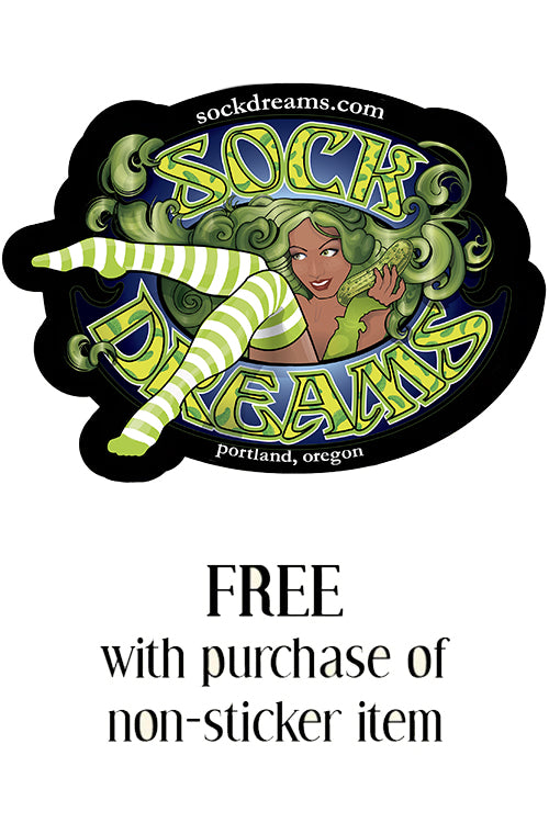 This peculiar pickle sticker is inspired by the Portland Pickles baseball team! Our mascot is decked out in our lime and sweet cream Longer Striped Extraordinary Thigh Highs for the occasion. Sock Dreams is proud to sponsor our local team this season! Made in the USA.