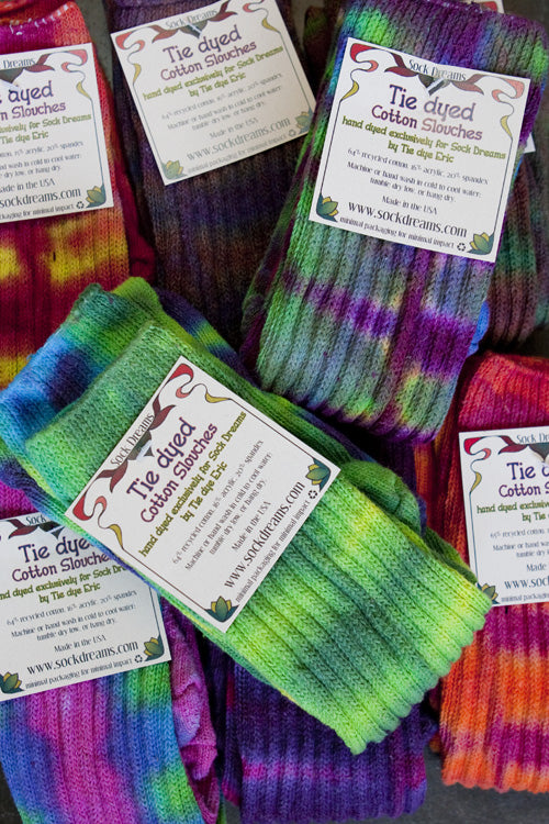 Our knee high cotton slouch socks vibrantly hand dyed in classic rainbow pattern by the one and only Tie Dye Eric, right here in Portland Oregon. Knit and dyed in the USA