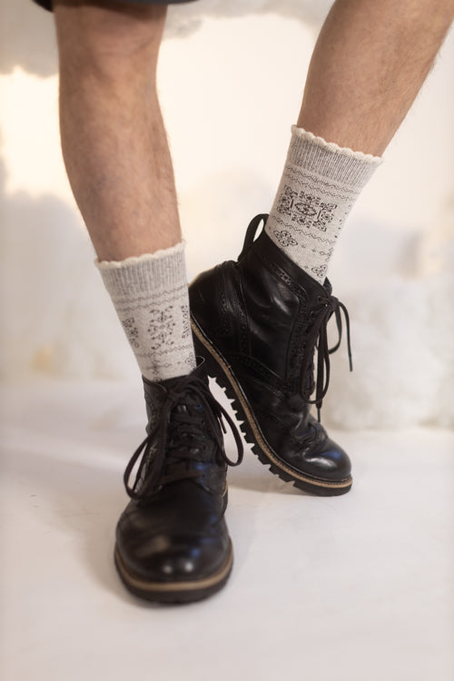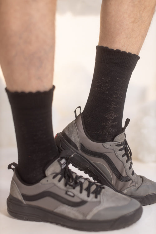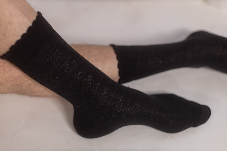 These bamboo crew socks are definitely knockouts! Since the soft silkiness of bamboo just begs for ornament, we added a subtle floral motif from scalloped cuff to toe that opens up beautifully and highlights the loveliness of the yarn -- now in a larger foot size! Made in the USA.