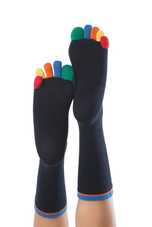 Also called “split-toe socks”, tabi socks have been worn in Japan since the sixteenth century, reaching their peak during the Edo period (1600-1868). Developed to wear with sandals & wooden clogs called geta, they have a separate section for the big toe, allowing sandals to be worn more easily. Like toe socks, tabi fit just as comfortably into closed-toe shoes. They are a good option for folks who want the benefits of toe socks, but cannot or do not want to deal with individual toe pockets.