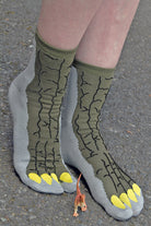 Go, go Godzilla! Get ready to smash some tiny buildings with marvelously monstrous feet. These split toe socks don't even have to be dinosaur feet, maybe they're dragon feet! It's okay to dream of giant reptiles when wearing fun socks. In fact, we recommend it!
