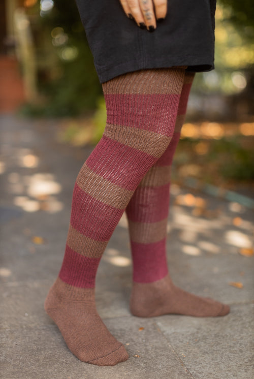We loved the chunky, scrunchable, sweater-like knit of our Long Cuffable Scrunchable Socks so much that we had to get more and more styles made on that machine! Now we're happy to offer knee highs, thigh highs, over the knee socks -- even leg and arm warmers in stripes, solids, marled and tie dyed versions of some of our very favorite socks. Great for fashion, hiking, or lounging around. Made by Sock Dreams in the USA!