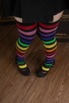 Bright rainbow stripes alternate with black for contrast that adds an extra pop to these thigh high stockings!
