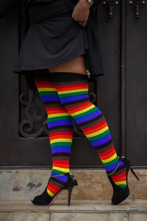 These feature the same extra-long, tube footed construction as our Long Pride Stripes Tube Socks! What better way to celebrate the diversity of the LGBTQ+ community than with a sock that can fit a wider range of people? Tube style feet mean that these will comfortably fit most sizes of foot, while the extra-long length means they can still be over the knee or thigh high on folks with longer inseams or curvier legs! Unlike traditional tube socks, we designed these to have a low-profile toe seam on the top of the foot, instead of at the end of the toe, for improved comfort.