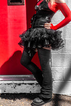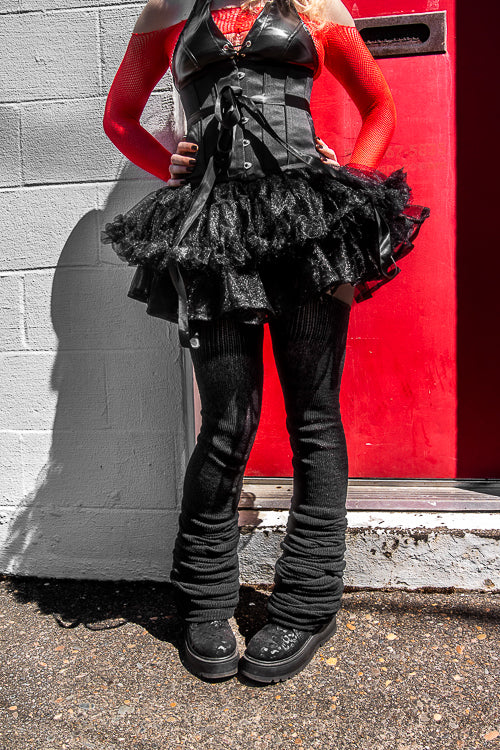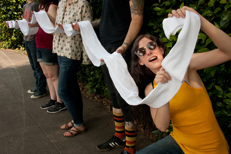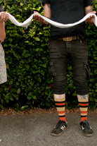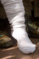 Outrageously long socks at about 200 inches that will scrunch beautifully all the way down your legs. With a soft ribbed cuff and loose flat knit, they slide and slouch with ease. Made in the USA.