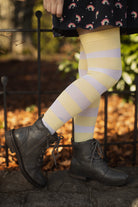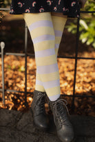 Oops! Our sheer and opaque Gossamer Striped socks were accidentally made with wide stripes! If you like this bolder look, grab a pair quick, because once they're gone, they won't be reordered! Made in the USA.