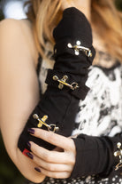 Bright, silver colored hardware adorns these cotton arm warmers, clipping together the grommeted straps which encircle them!