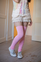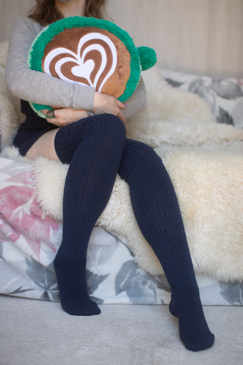 Gorgeous, thick ribbed thigh highs that stay up well and look great cuffed! Their terry-lined feet add extra warmth, comfort and cushiness. These socks may feel tight going on the leg and need to be hand-stretched before wearing, but the results are worth the effort. Made in the USA.