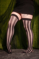 Fishnet and solid knit alternate in black vertical stripes on these thigh high stockings, for a striking effect!
