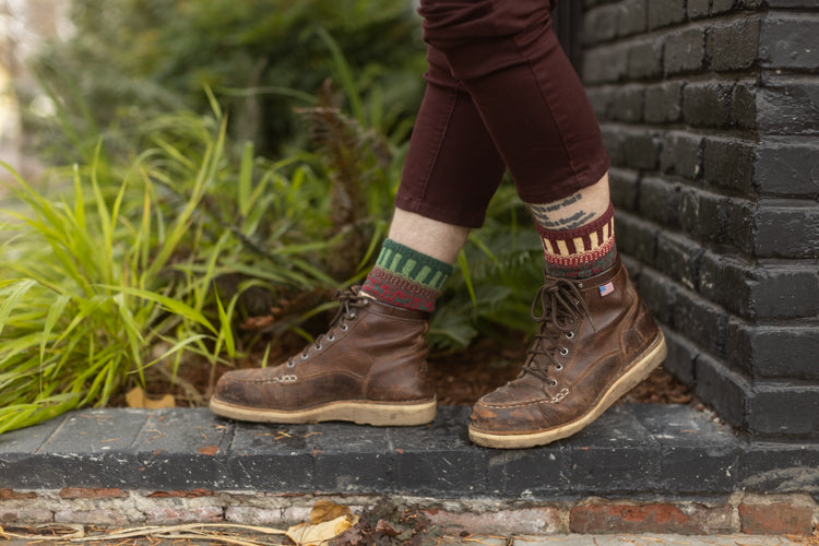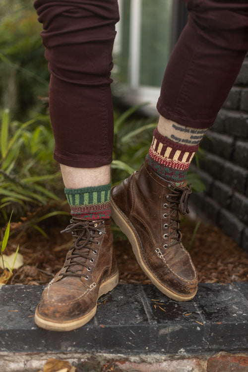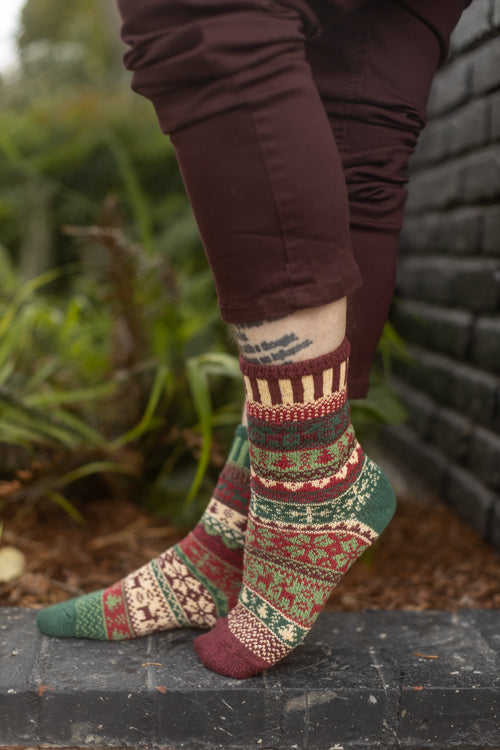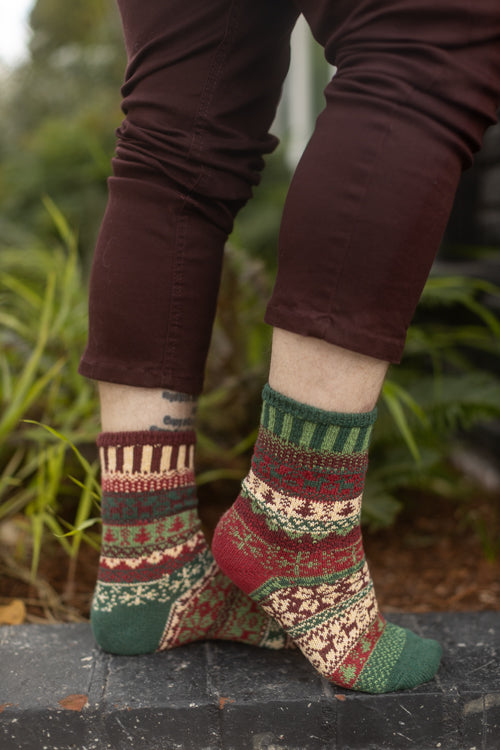 Festive Fair Isle crews feature bands of reindeer, fir tree and poinsettia patterning, in jolly shades of red, green and white. Like all Solmate socks, they are perfectly mismatched.
