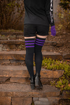Just like our best-selling Americana Thigh Highs, but in a more manageable length for those with shorter inseams (or who just don't want their thigh highs super-long). Stretchy thigh high socks with sporty top stripes, available in delightfully dark colorways! Made with nylon, these are perfect for all your athletic pursuits, such as visiting the goth club! These run about 4 inches shorter than their longer counterpart. Made in the USA for Sock Dreams.