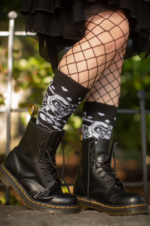 If you love the villainess Harley Quinn as much as we do, then these are the socks for you, Puddin'! Harley is knitted right into the fabric in high contrast black and white, wielding a spooky striped mallet, made in collaboration with DC Comics!