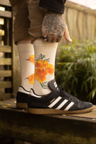The sunshine orange blooms of the California state flower truly pop against a cream colored background on these cheerful socks!