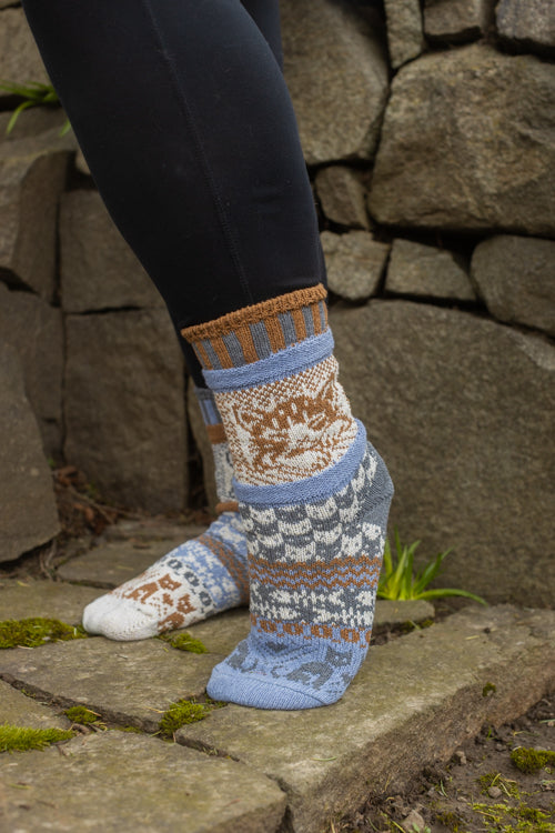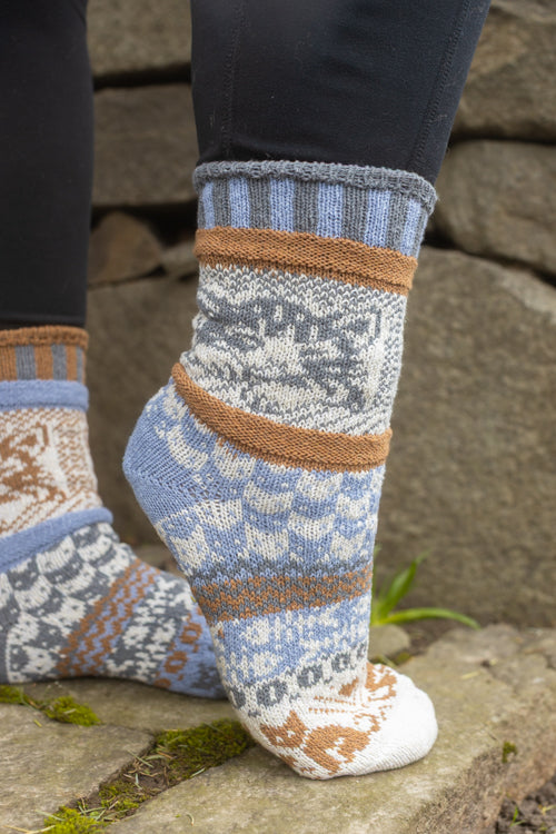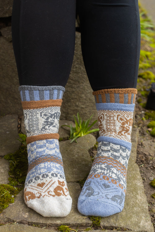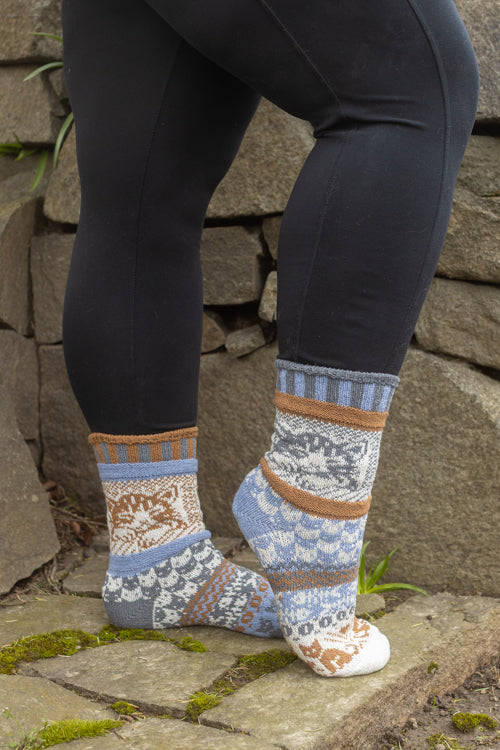 Like all Solmate socks, they are knitted with the same colors and patterns on both socks, only with the colors appearing in a different order on each side, for a subtly mismatched pair.