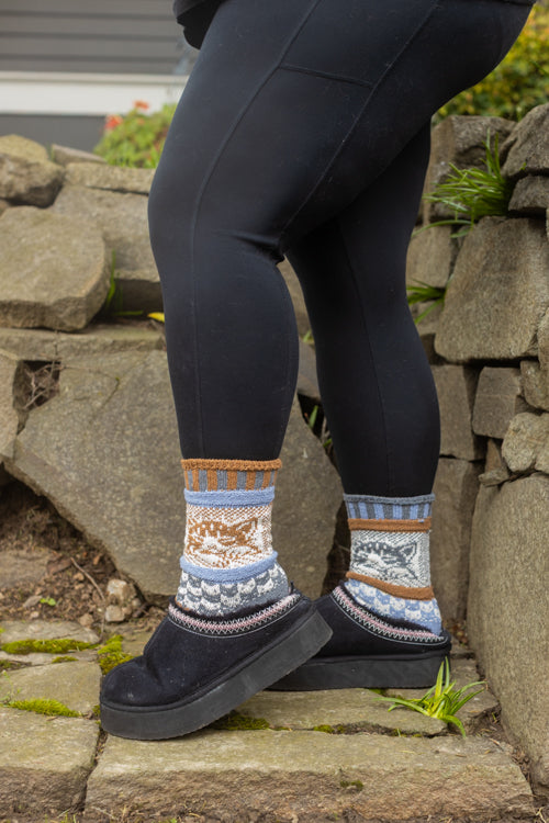 These sweater-like crew socks feature bands of cat themed patterns, from large-scale cat faces at the ankles, to cat silhouettes and fish skeletons on the feet. There's even a clever chevron pattern, reimagined as cat faces!