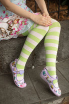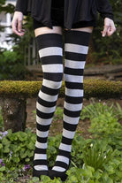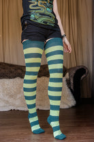 In our never-ending quest to find the longest and comfiest socks for all our sock-loving friends we've taken our super stretchy Striped Extraordinary Thigh High socks and added several more inches, so now they go to the tippy tops of most legs and are comfortably and reliably over the knee on longer and curvier legs! Made in the USA.