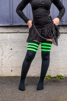 When we designed these bright new colorways of our Americana Gothic Thigh Highs, we added sugar, spice, and everything nice to create these perfect socks! Bold neon top stripes pop against a black background to make a powerful statement.