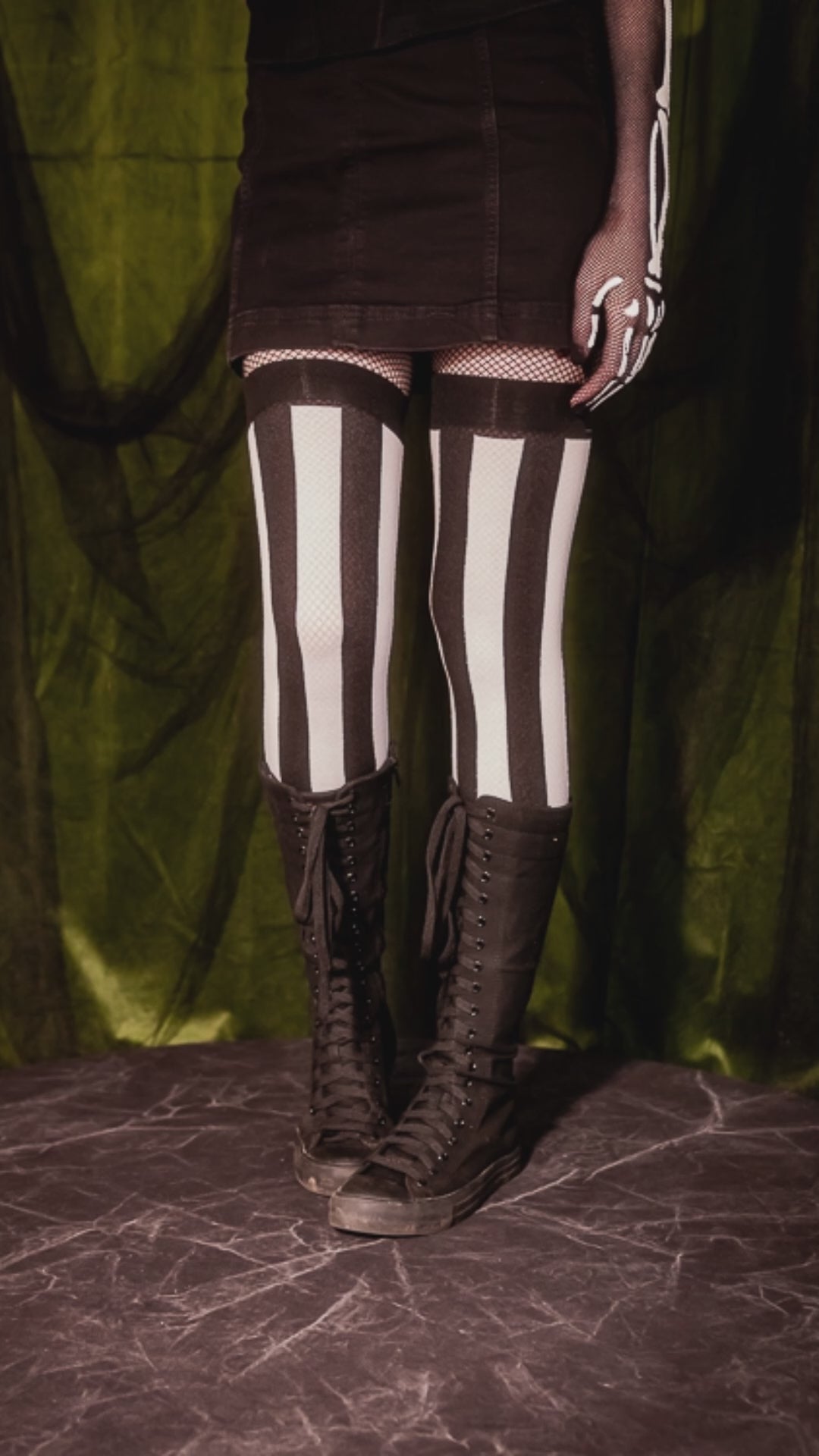 The black and neon orange vertical stripes of these stockings are sure to turn heads, while lending any outfit some Halloween flare!